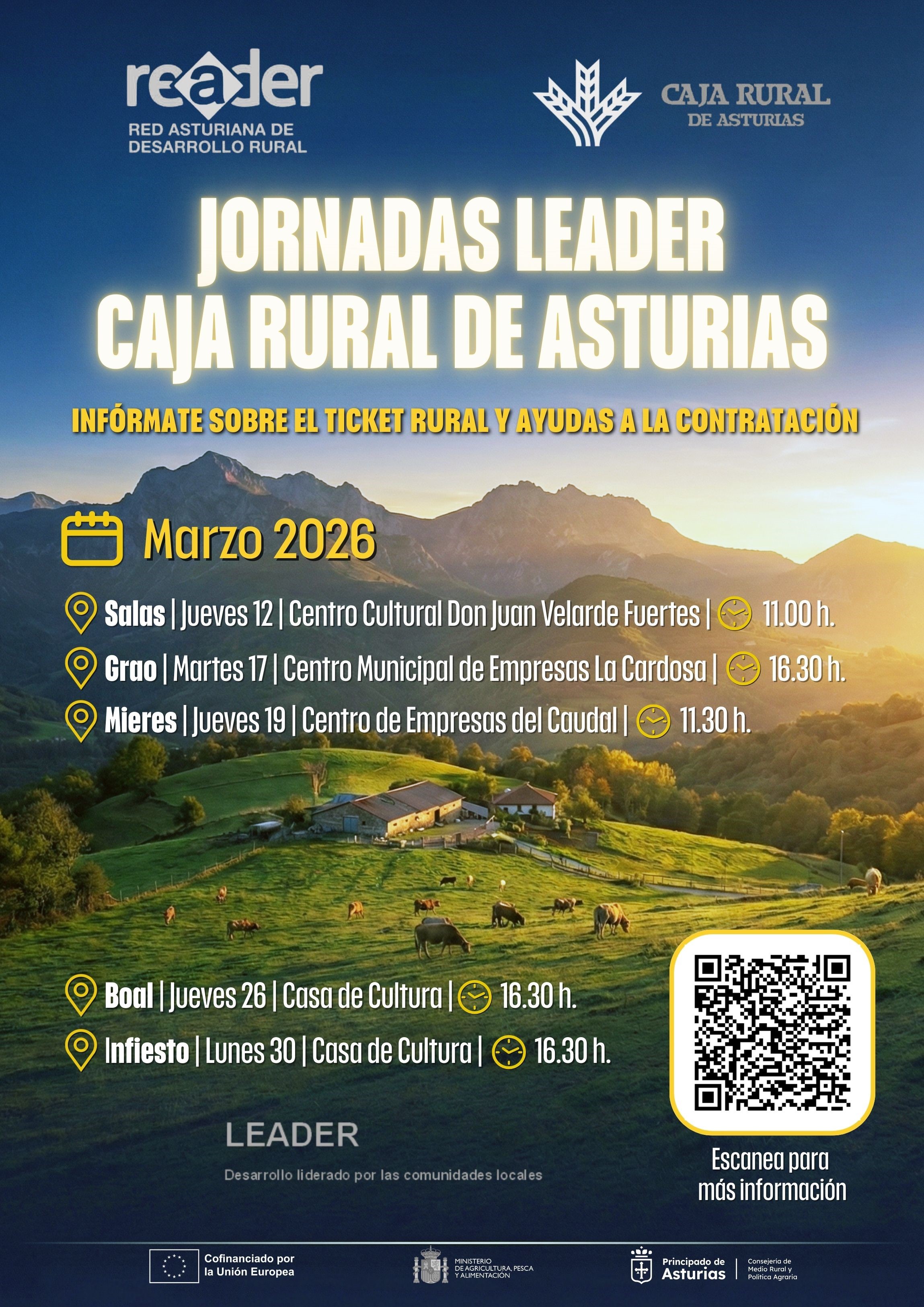Con motivo del lanzamiento de la nueva convocatoria Leader 2026, la Red Asturiana de Desarrollo Rural y Caja Rural de Asturias han organizado una serie de jornadas de difusión, fundamentalmente enfocadas al Tique Rural y a las ayudas a la contratación, conocido como Tique Asalariado, una de las novedades de este periodo.